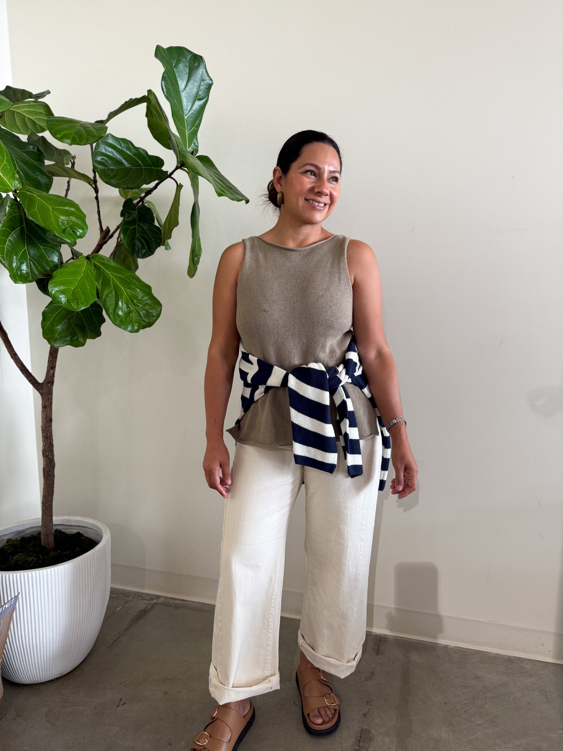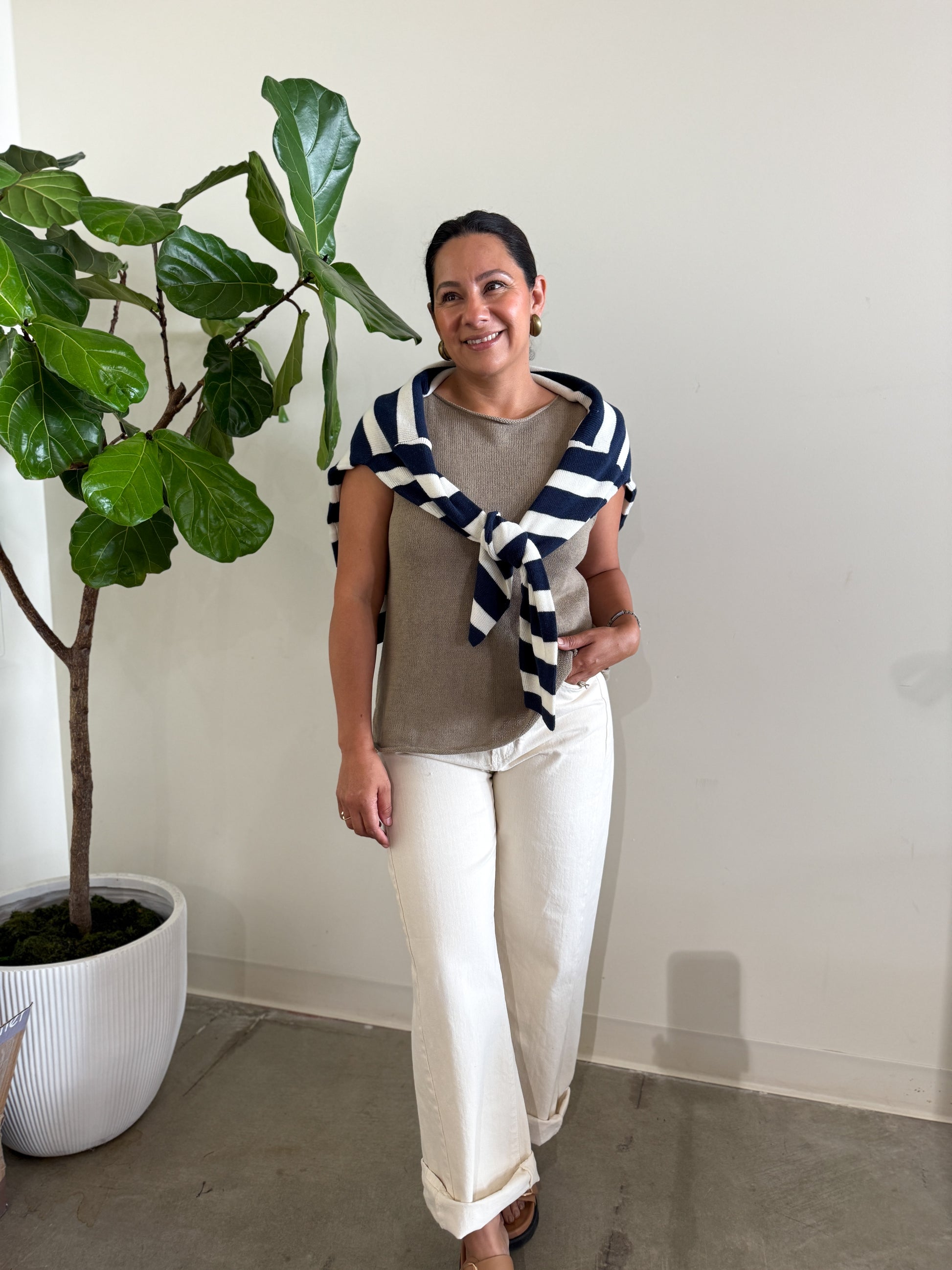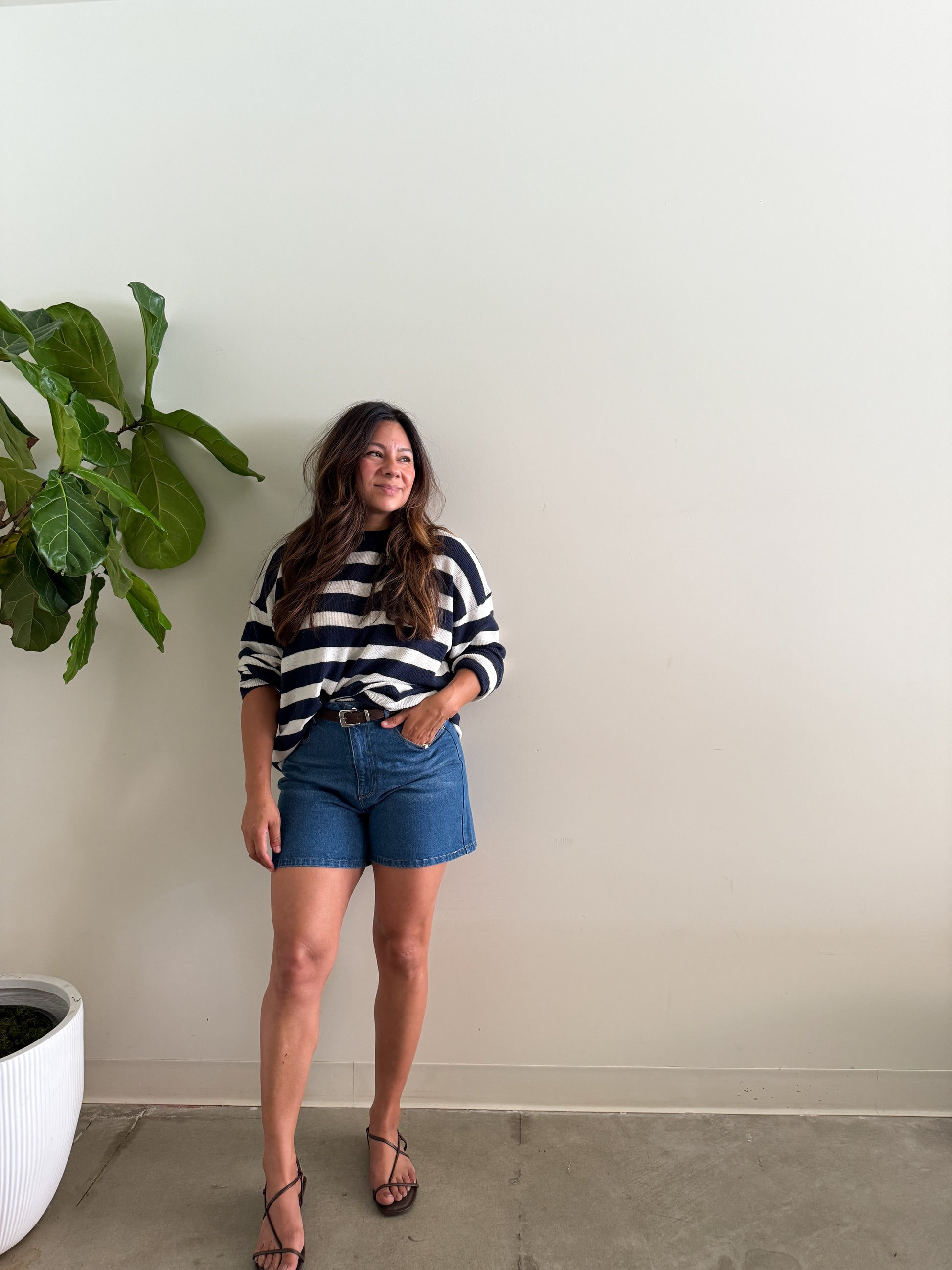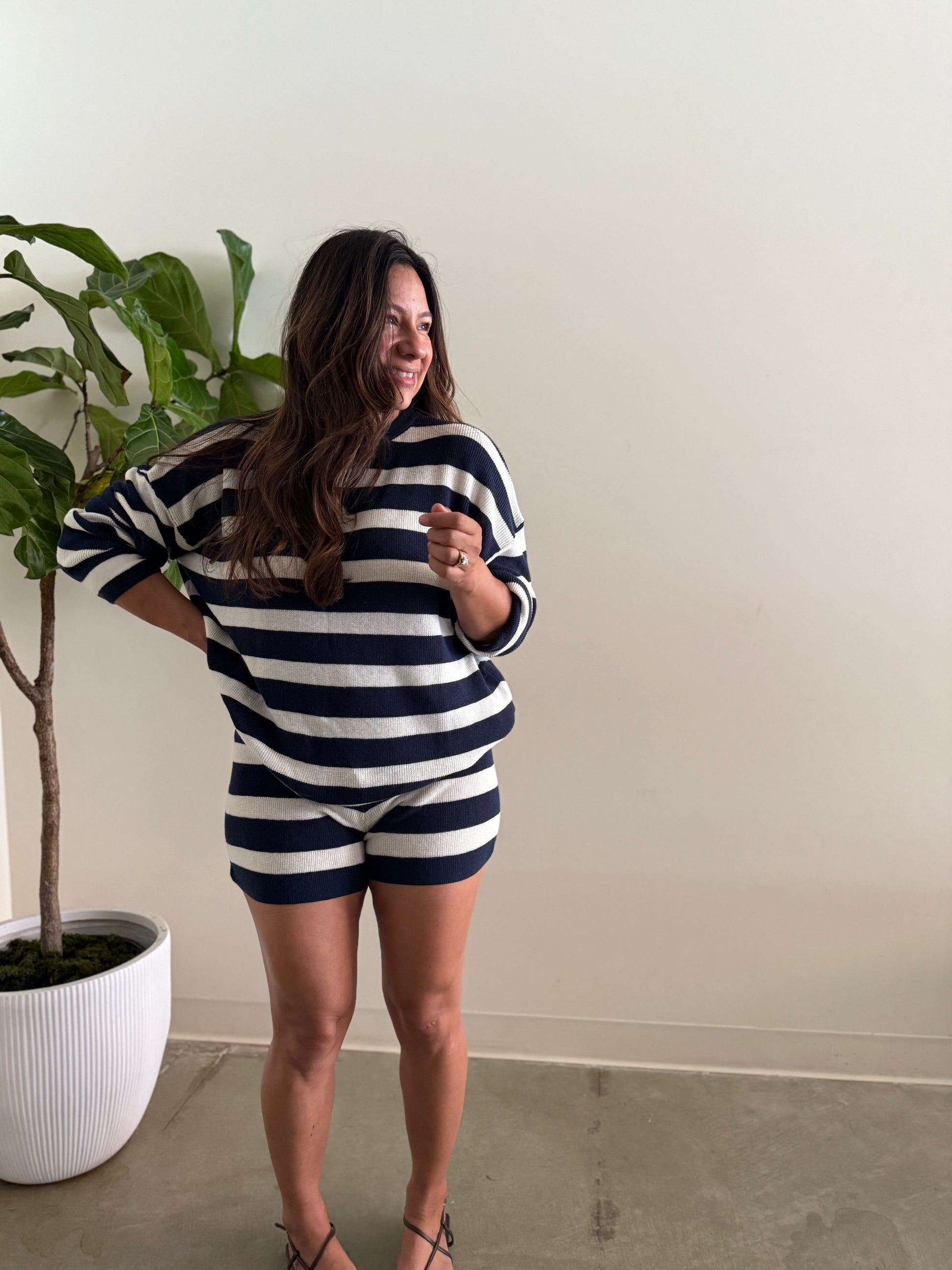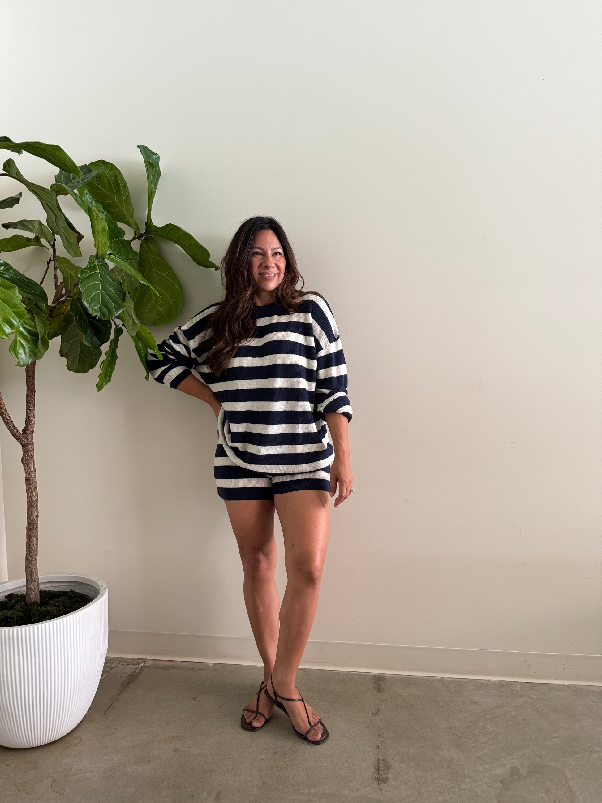 Stay cozy and stylish with this knitted wide stripe sweater and shorts set. The oversized sweater and comfy-fit shorts create a relaxed, cool vibe—perfect for spring outings with friends or casual dog walks.
